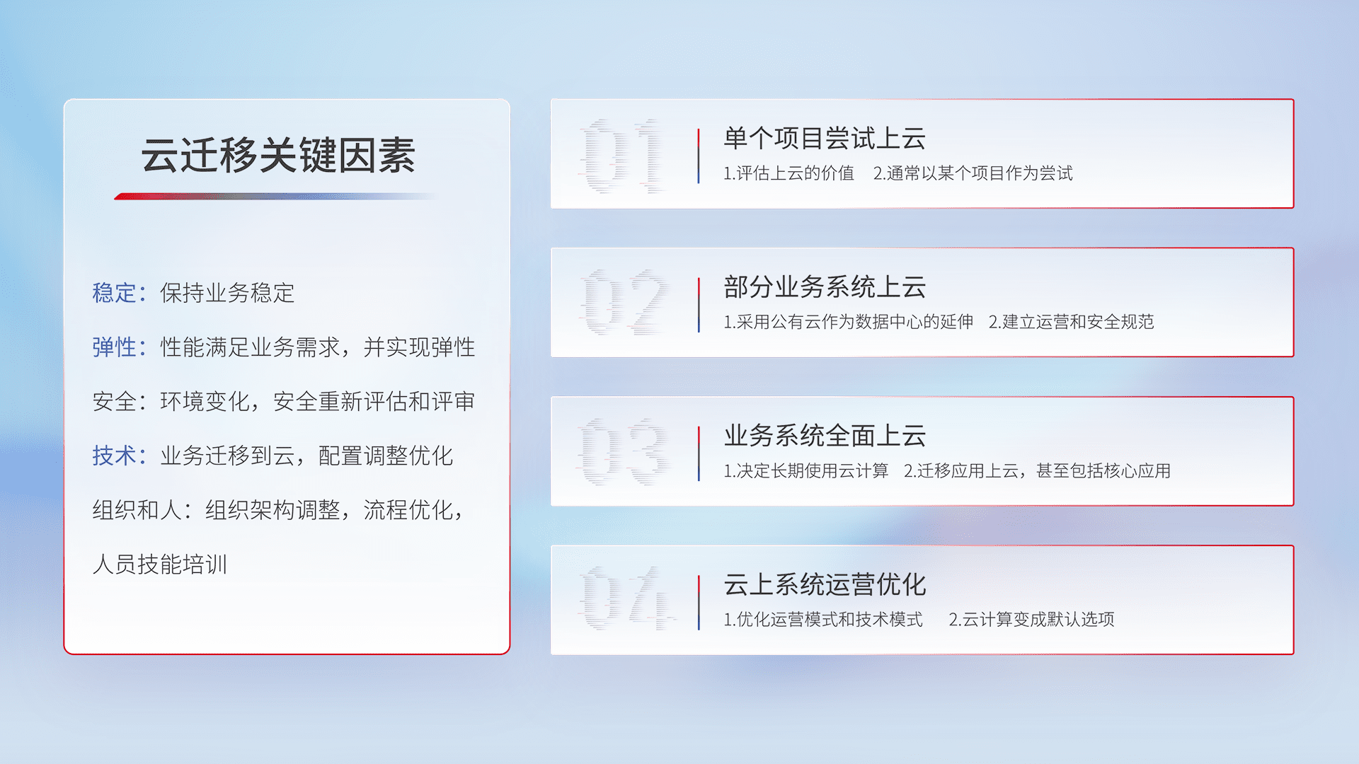 结合实际业务,,,,从规划设计、、、、云平台选型、、、云原生改造、、、、数据迁移、、、、集成交付,,,迁移全过程为客户识别最佳上云路径,,,做好风险识别管理,,,设计网络架构、、、、身份权限、、安全审计合规、、、操作审计、、、日志审计、、监控告警策略、、、多站点容灾设计等,,,,对云上基础设施进行整体规划,,,提升IT治理水平,,,,以满足弹性、、、高可用、、、、高性能的需求。。