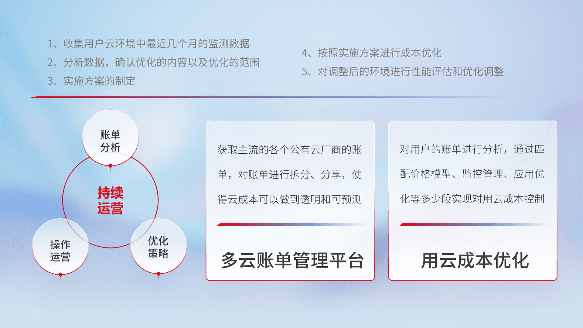 通过多云纳管,,,以统一的资源数据模型把客户的云资源进行抽象和封装,,,,进而实现对多云资源的统一操作,,保障云资源管理的可靠性、、稳定性与可用性。。。量身定制化运维内容,,,,配置、、、开发运维、、补丁管理、、、备份、、监控、、、、认证和访问管理、、、审计和日常巡检等,,,保障在用云过程中的可靠度,,,,稳定度以及高可用率。。。
